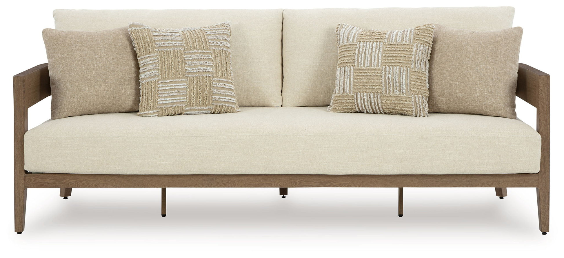 Elevate the appeal of easy-breezy living with this outdoor sofa. Made to look like wood yet durable enough to weather the elements, it's sure to serve you and your besties well, year after year. The gently curved piece features cushions wrapped in Nuvella+™ high-performance fabric for plush refinement. Patterned accent pillows infuse delightful texture.